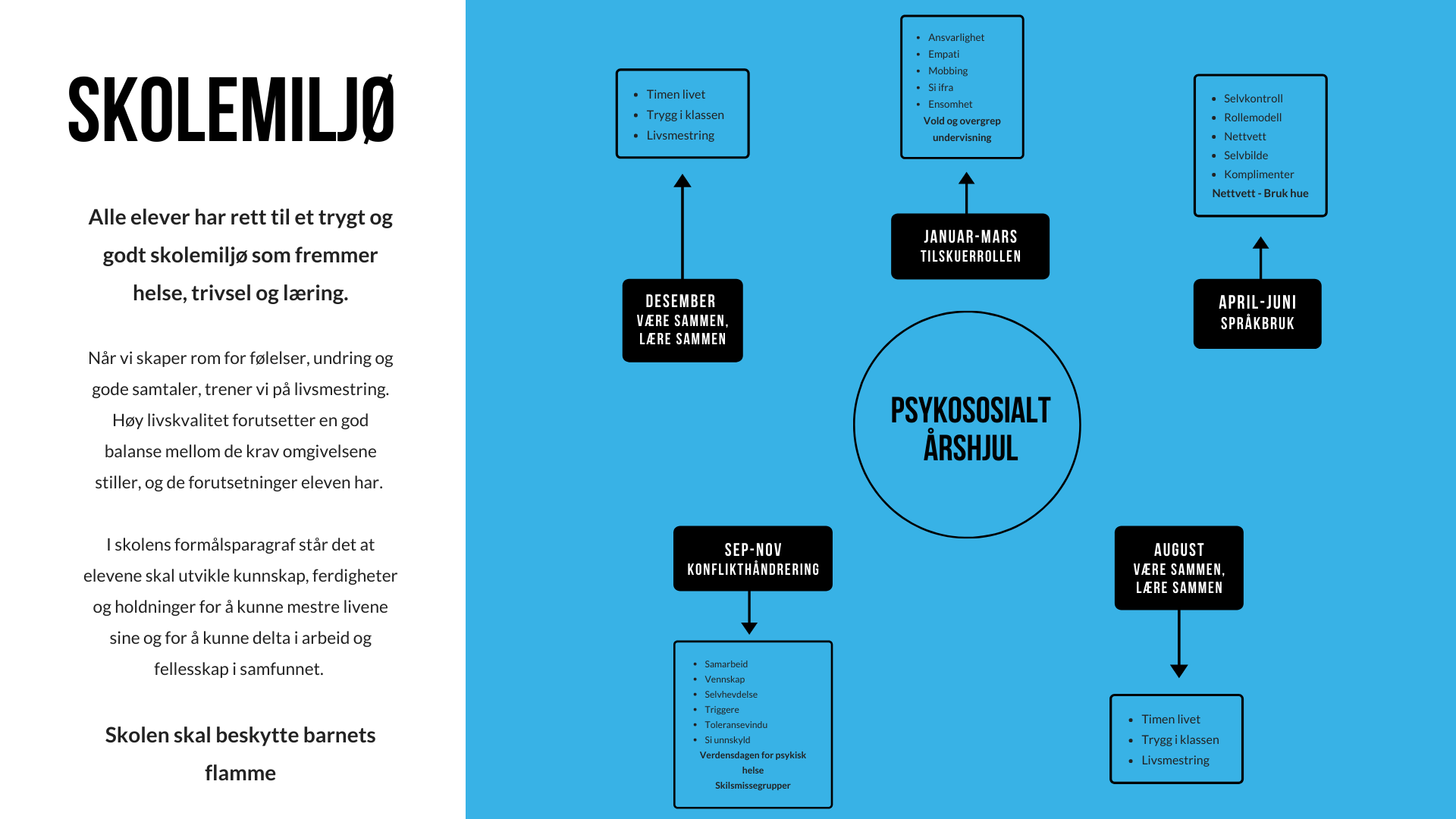 Trygghet og trivsel er grunnlag for all læring. Fokuset på et godt læringsmiljø og utvikling av elevenes sosiale kompetanse har derfor høy prioritet.